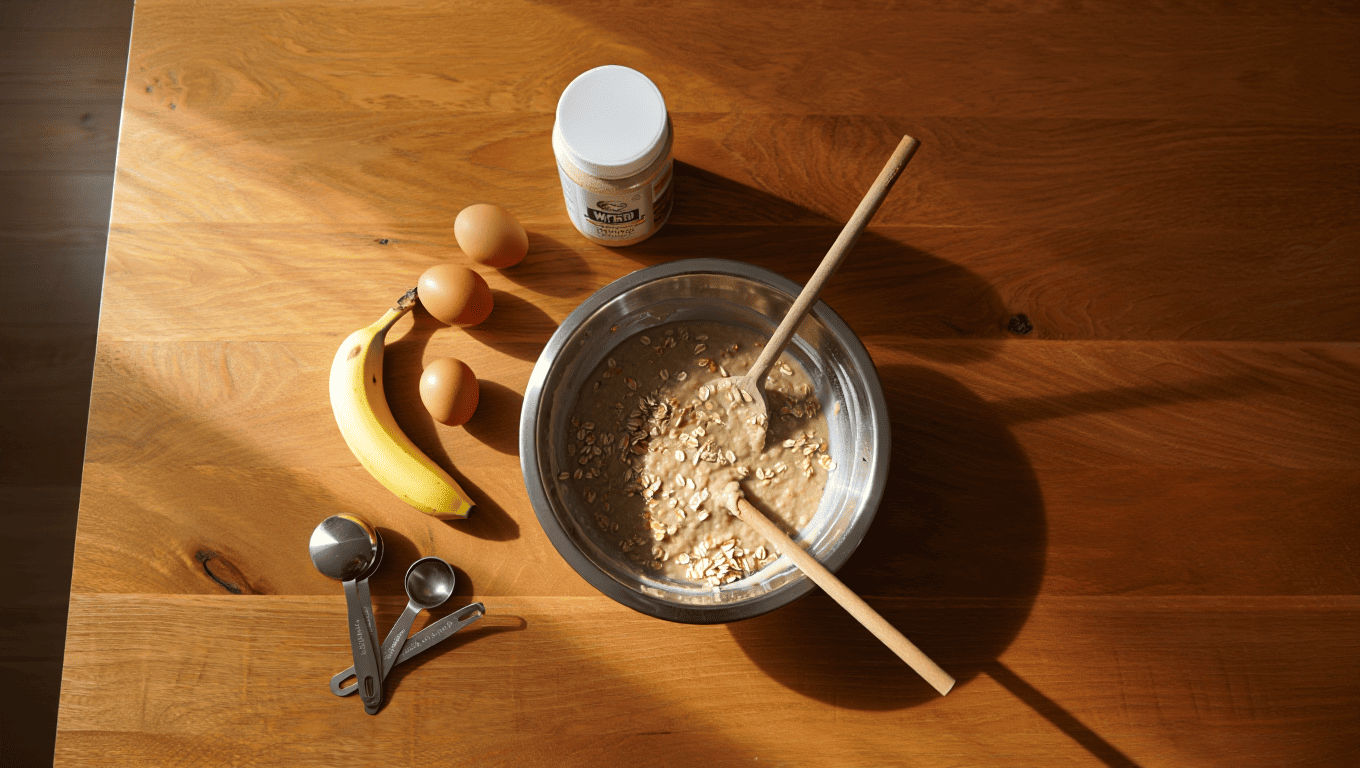 Mélangez d’abord 50g de farine d’avoine pour les fibres. Ajoutez 30g de whey, soit environ un scoop. Cette base sèche garantit la structure de votre recette pancake protéiné avec Whey. 🥣